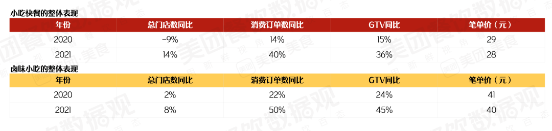 據(jù)美團數(shù)據(jù)顯示:2020年疫情爆發(fā)期間,鹵味小吃的門店并沒有減少,反而小幅提升;線上的消費增長也跑贏小吃快餐。