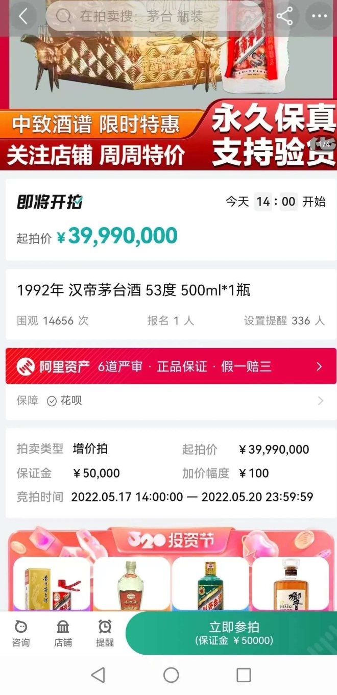 5月16日,阿里拍賣平臺(tái)上線一瓶“漢帝茅臺(tái)酒”,起拍價(jià)3999萬(wàn)元,加價(jià)幅度100元。最后競(jìng)買號(hào)為T8492的買家出價(jià)99.999999億元,隨后該拍品下架,以流拍結(jié)束了這次鬧劇。