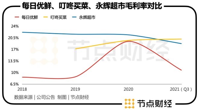 例如永輝超市在社區(qū)團(tuán)購上的老對手叮咚買菜,2021年四季度的毛利率為27.7%,較三季度大幅提升近10個百分點(diǎn),說明社區(qū)團(tuán)購已經(jīng)放棄了虧本燒錢,生鮮零售的行業(yè)競爭也趨于緩和,盈利或許是業(yè)內(nèi)公司目前的共識。