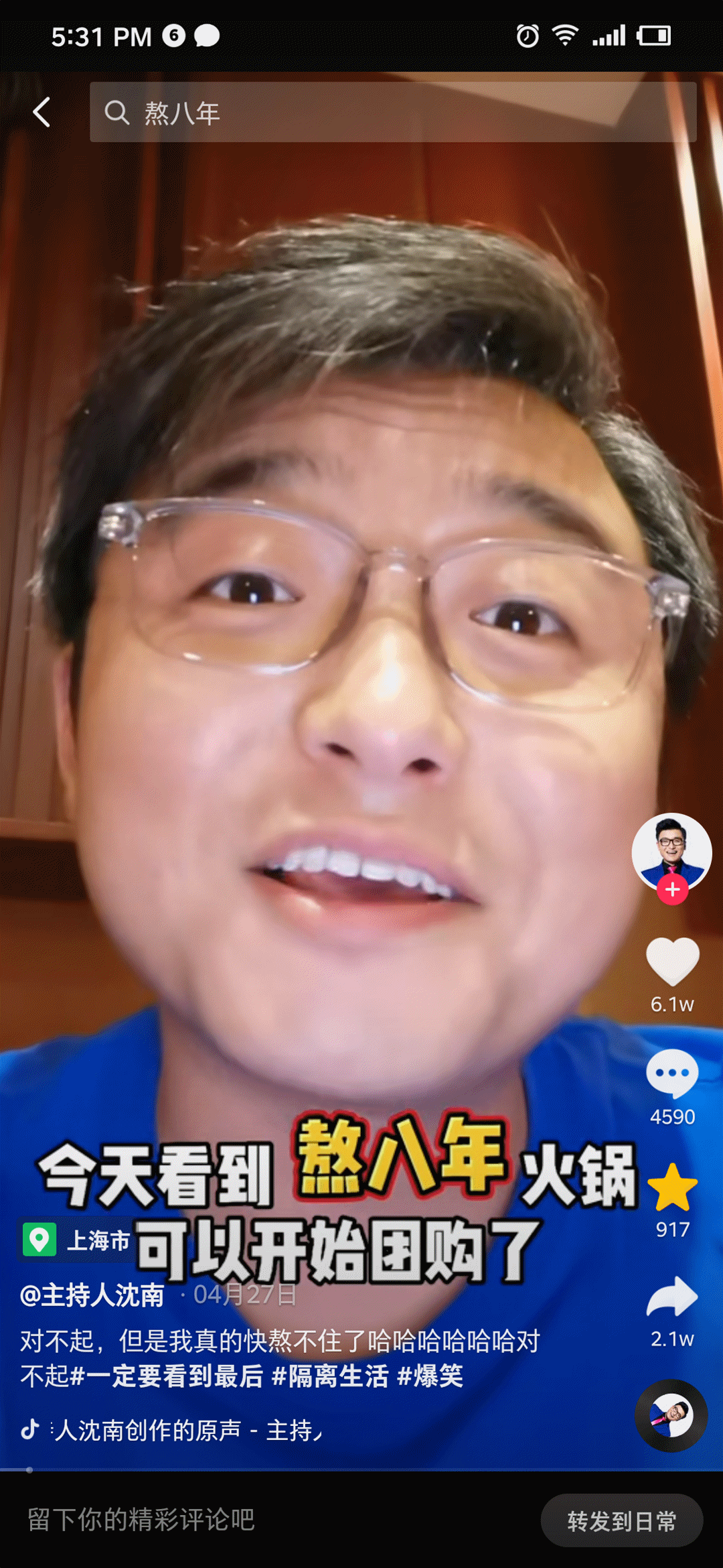 抖音上,東方衛(wèi)視主持人沈南在自己的賬號(hào),用詼諧的語氣,講述了他們社區(qū)團(tuán)購(gòu)火鍋的一次搞笑經(jīng)歷。