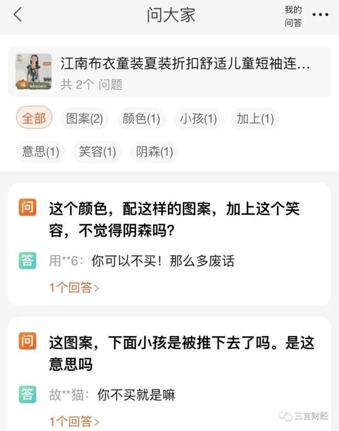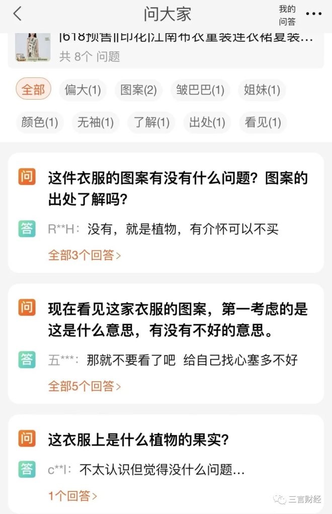 而當(dāng)三言財經(jīng)咨詢店鋪客服時,對方也表示不清楚,一直強調(diào)是設(shè)計師設(shè)計的圖案。