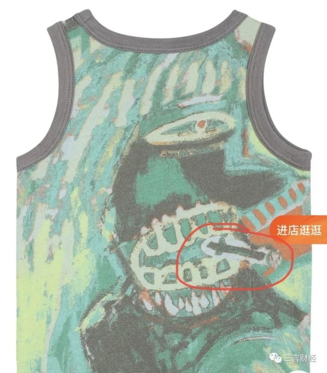 另外一款馬甲童裝上疑似出現(xiàn)了抽煙的圖案,雖然抽象但是也極容易讓人產(chǎn)生聯(lián)想。