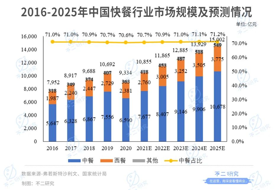 目前,中式快餐行業(yè)正經(jīng)歷快速發(fā)展,老鄉(xiāng)雞還有很大的成長空間。弗若斯特沙利文報(bào)告顯示,2020年~2025年,中式快餐行業(yè)復(fù)合年增長率預(yù)計(jì)為14%,2025年市場(chǎng)規(guī)模將達(dá)到12685 億元;根據(jù)國家統(tǒng)計(jì)局?jǐn)?shù)據(jù),2020年連鎖快餐服務(wù)業(yè)營收為1102億元,老鄉(xiāng)雞占比僅為3.13%。
