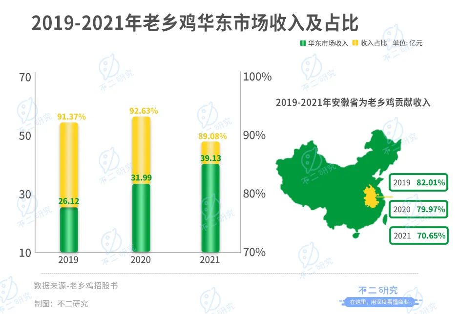 招股書顯示,2019-2021年,來自華東市場(chǎng)的收入分別為26.12億元、31.99億元和39.13億元,分別占到當(dāng)期總營收的91.37%、92.63%和89.08%;其中安徽一省為老鄉(xiāng)雞貢獻(xiàn)的收入占比就高達(dá)82.01%、79.97%和70.65%。