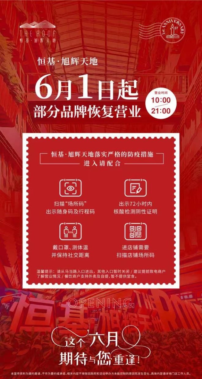 6月1日起,虹橋天地恢復(fù)營業(yè),營業(yè)時間為10:00-20:00。