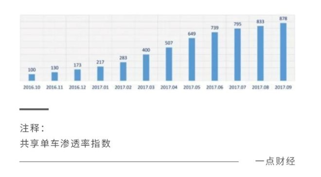 中國信通院2017年發(fā)布的首份《共享單車行業(yè)發(fā)展指數(shù)報告》顯示,自2016年10月以來,共享單車在中國呈現(xiàn)出爆發(fā)式增長。共享單車滲透率指數(shù)(滲透率指數(shù)反映共享單車在我國的普及程度)一年增長近8倍,2017年3月到6月漲勢尤其突出。