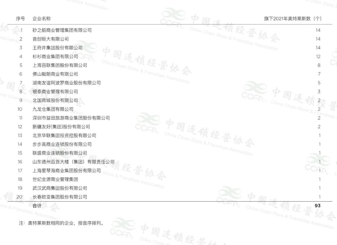 5月31日,根據“2021年中國購物中心年度調查統(tǒng)計”結果,按照各企業(yè)2021年底在營的各類購物中心數,中國連鎖經營協(xié)會(CCFA) 發(fā)布“2021年中國購物中心企業(yè)TOP70”,其中包括開發(fā)運營購物中心的綜合零售商。同時,根據本次調查結果,協(xié)會首次公布全國各主要奧特萊斯開發(fā)運營企業(yè)名單。