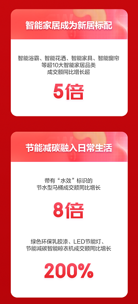 隨著低碳生活方式的普及,綠色環(huán)保居家產(chǎn)品也創(chuàng)出開門紅。京東新百貨居家618開門紅10分鐘,帶有“水效”標(biāo)識(shí)的節(jié)水型馬桶成交額同比增長(zhǎng)8倍,綠色環(huán)保乳膠漆、LED節(jié)能燈、節(jié)能減碳智能晾衣機(jī)成交額同比增長(zhǎng)200%。