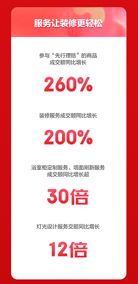 覆蓋居家商品的“送、裝、退、用、換、養(yǎng)、修”全周期,京東新百貨居家“省心裝”服務(wù)將優(yōu)質(zhì)消費(fèi)體驗(yàn)貫穿于售前、售中、售后的每個(gè)環(huán)節(jié)。京東新百貨居家618開門紅10分鐘,京東居家“省心裝”商品開門紅成交額同比增長(zhǎng)170%,參與“先行理賠”的商品開門紅成交額同比增長(zhǎng)260%。裝修服務(wù)成交額同比增長(zhǎng)200%,櫥柜定制服務(wù)成交額同比增長(zhǎng)超4倍,浴室柜定制服務(wù)、墻面刷新服務(wù)成交額同比增長(zhǎng)超30倍,燈光設(shè)計(jì)服務(wù)交額同比增長(zhǎng)12倍。