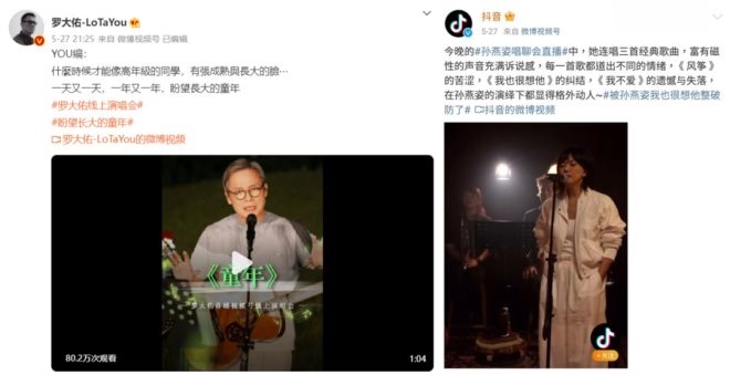 5月27日晚,“音樂教父”羅大佑和“亞洲天后”孫燕姿的線上唱聊會同時開演。兩位歌手分別通過微信視頻號和抖音號直播,“隔空打擂”讓眾多歌迷直呼難以選擇。
