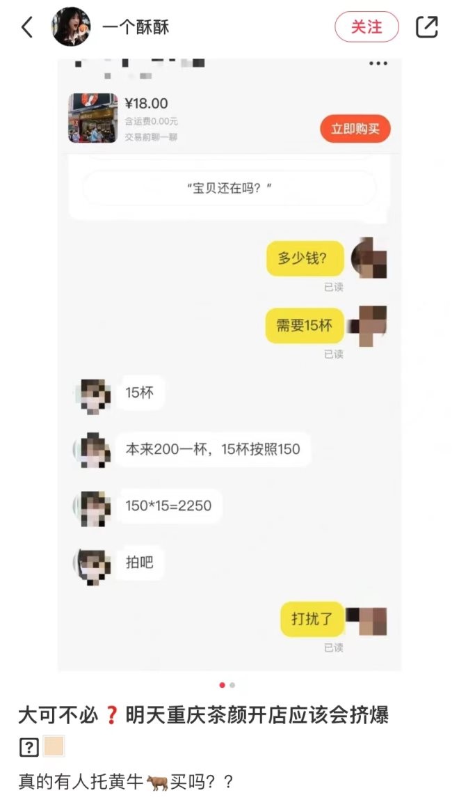 此外,新店開業(yè)引發(fā)消費者排隊購買,因為隊伍太長還疑似出現(xiàn)了黃牛代排代買現(xiàn)象,一杯奶茶更是被炒到了150元。