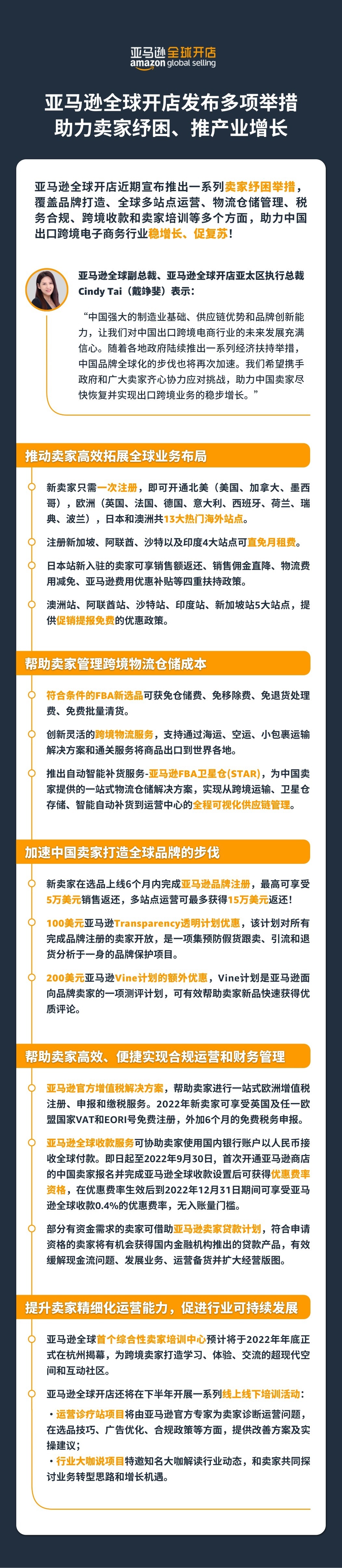 亞馬遜全球開店近期宣布推出一系列賣家紓困舉措,覆蓋品牌打造、全球多站點運營、物流倉儲管理、稅務合規(guī)、跨境收款和賣家培訓等多個方面,旨在幫助中國出口跨境電子商務行業(yè)穩(wěn)增長、促復蘇,助力中國賣家進一步拓展全球業(yè)務并打造國際品牌。