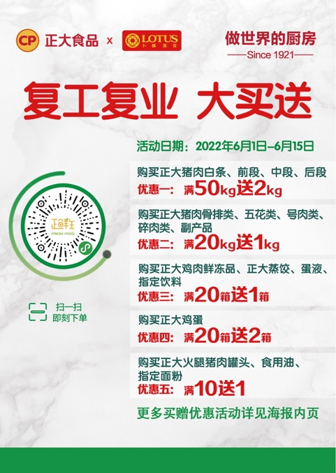 卜蜂蓮花攜手正大食品為餐飲行業(yè)雪中送炭,紓困解難,推出了“復(fù)工復(fù)產(chǎn)大買(mǎi)送”的六一促銷(xiāo)活動(dòng)。