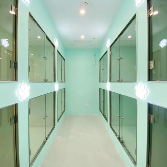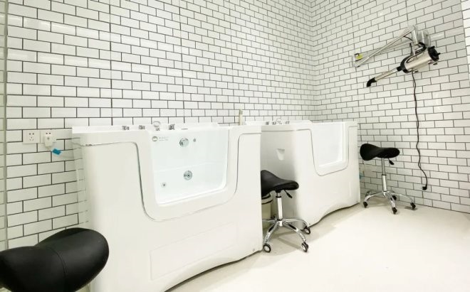 入口右側(cè)是高端專業(yè)洗護(hù)區(qū),提供高端寵物洗護(hù)、美容、康養(yǎng)和專業(yè)訓(xùn)練的服務(wù),鏟屎官可以24h遠(yuǎn)程監(jiān)控。