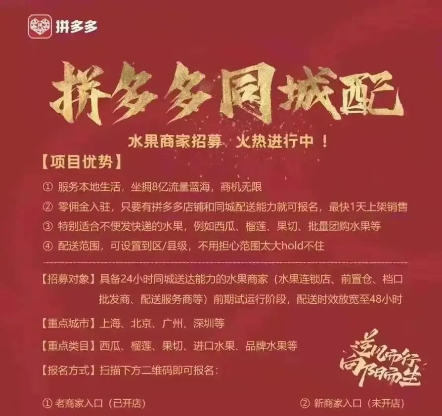 今年4月,拼多多在北上廣深這些一線城市秘密測試“拼多多同城配”,招募具備24小時(shí)同城配送能力的水果商家,例如水果連鎖店、前置倉、檔口批發(fā)商等。這一方面意味著拼多多要進(jìn)入“五環(huán)內(nèi)”拓客,另一方面,拼多多又要在最后一公里上與美團(tuán)閃購、淘鮮達(dá)、京東到家等成為新對(duì)手。