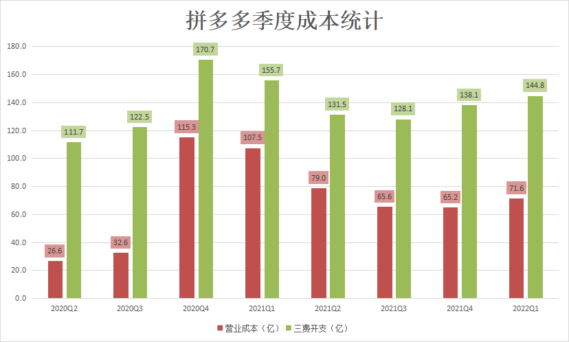 追增長的階段已經(jīng)過去,現(xiàn)在只能“節(jié)流”了。具體來看,拼多多的成本一個(gè)是營業(yè)成本,包括支付服務(wù)費(fèi)、履約費(fèi)、商家支持服務(wù)等,另一個(gè)就是三費(fèi)開支:營銷、研發(fā)、行政費(fèi)用。