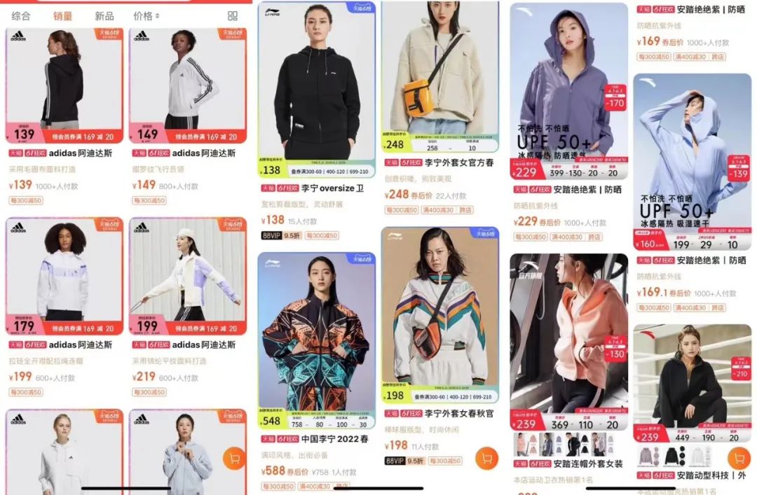 依次為adidas、李寧、安踏的女裝外套,明顯安踏的產(chǎn)品更緊身