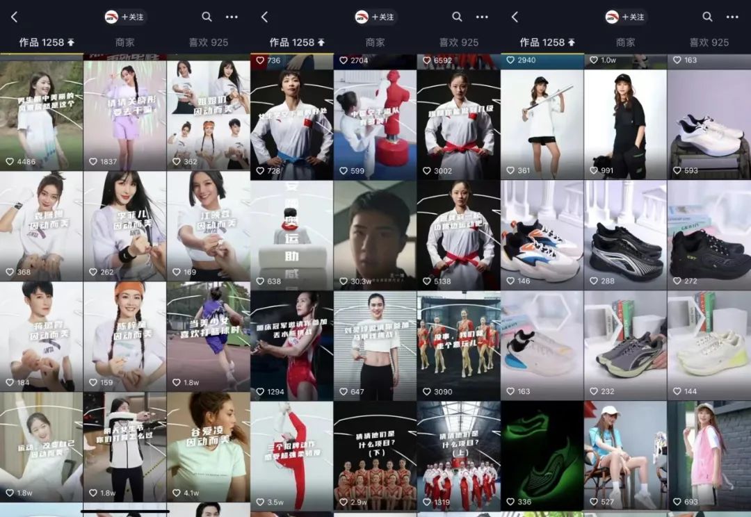 安踏的抖音官方賬號安踏體育,早期以宣揚(yáng)運(yùn)動內(nèi)容為主,內(nèi)容更受男性歡迎。2021年3月發(fā)布了女性營銷主題“因動而美”之后,才開始出現(xiàn)越來越多女性消費(fèi)者感興趣的內(nèi)容,諸如眾多女明星、女運(yùn)動員的運(yùn)動視頻,女模特的帶貨短視頻等等。