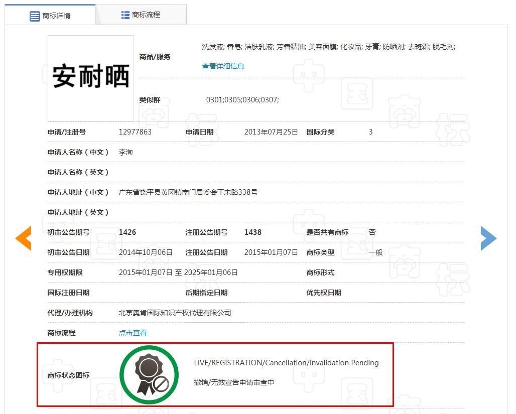 根據(jù)中國商標局信息顯示,自然人李洵于2013年7月首次對安耐曬第3類商標進行了申請,并于2015年1月獲得了注冊。目前該商標的狀態(tài)顯示為“撤銷/無效宣告申請審查中”。這意味著,有第三方對該商標提出了撤銷/無效宣告的申請,但根據(jù)《商標法》相關(guān)規(guī)定,該商標目前仍然有效。