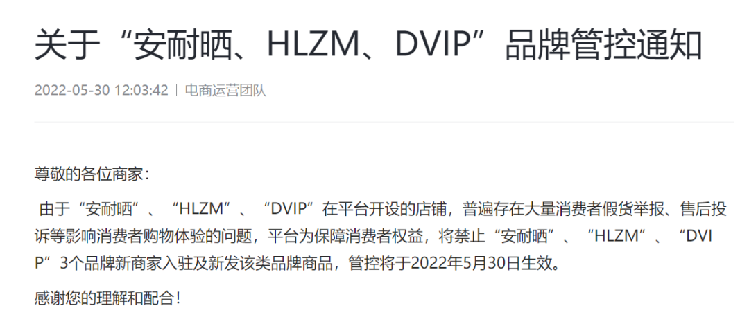 公告顯示,由于“安耐曬”“HLZM”“DVIP”在抖音平臺開設(shè)的店鋪,普遍存在大量消費者假貨舉報、售后投訴等影響消費者購物體驗的問題,平臺為保障消費者權(quán)益,自5月30日,將禁止這3個品牌的新商家入駐及新發(fā)這3個品牌旗下的商品。