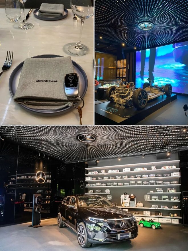 打出“精品零售、試駕、美食”一體概念的Mercedes me,內(nèi)部共兩層,一層包含展廳、周邊零售及西餐廳,真車展示加各式各樣的模型占據(jù)了大片空間。