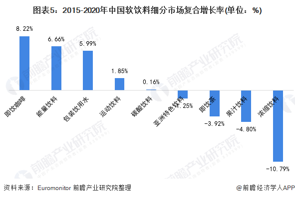 圖: 中國(guó)軟飲各細(xì)分市場(chǎng)年復(fù)合增長(zhǎng)情況,來(lái)源: 前瞻產(chǎn)業(yè)研究院