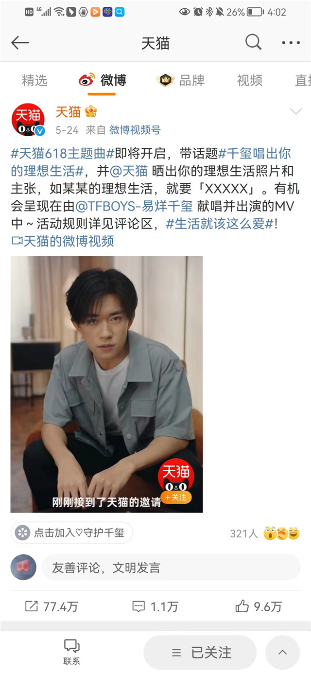5月24日,天貓發(fā)布了一條易烊千璽參演的預(yù)告視頻,向全網(wǎng)征集網(wǎng)友們的理想生活故事及照片,邀請全民共創(chuàng)理想生活之歌《生活就該這么愛》,頓時(shí)引來數(shù)萬網(wǎng)友的圍觀,相關(guān)話題詞閱讀破20億,討論量超300萬。