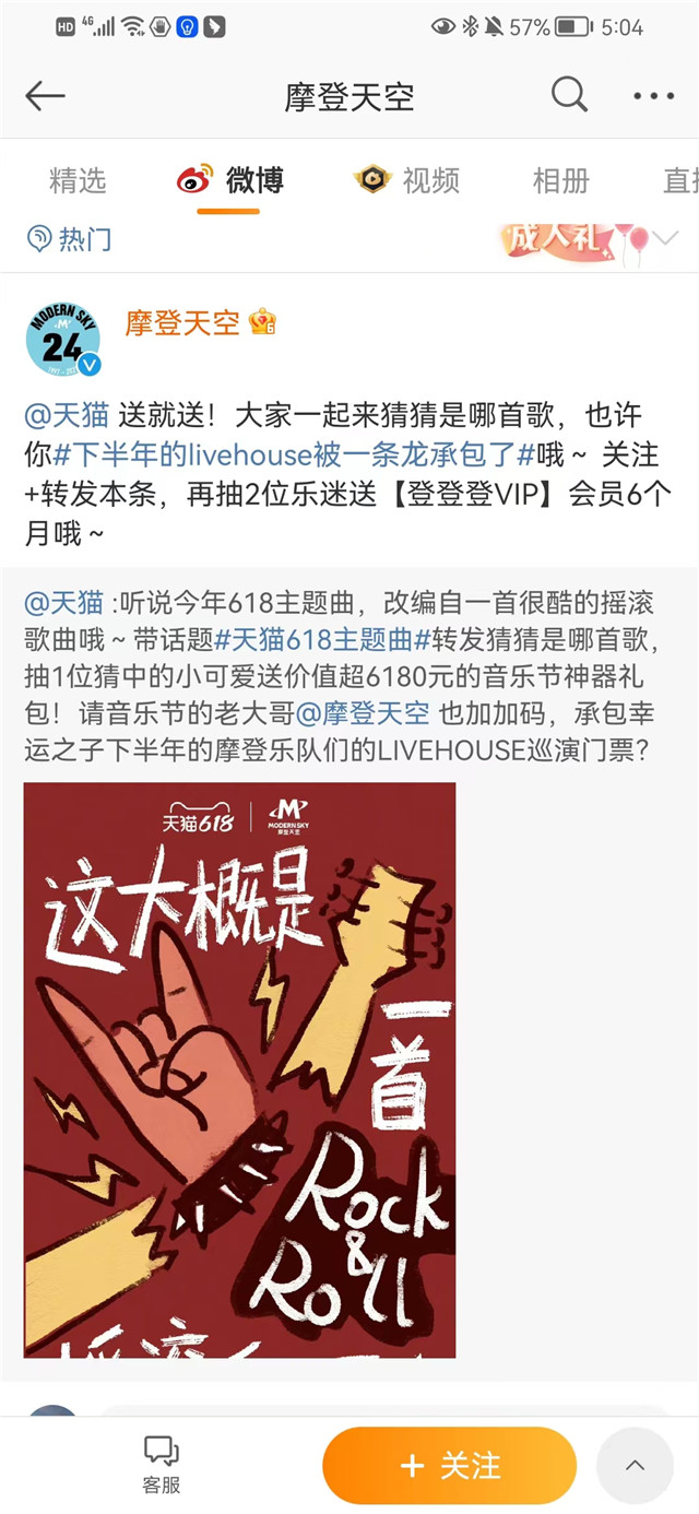 5月28日,一個(gè)“天貓618主題曲改編自一首很酷的搖滾歌曲”的消息火速傳播。隨后國內(nèi)集結(jié)最多樂隊(duì)的獨(dú)立唱片公司“摩登天空”官微正面回應(yīng),讓網(wǎng)友猜歌名并許諾抽取幸運(yùn)兒“承包下半年的livehouse”。瞬間搖滾圈的樂迷也按耐不住了,其中一小撮嗅覺靈敏的歌迷們,甚至猜出了這首歌的原創(chuàng)——搖滾樂隊(duì)“后海大鯊魚”。