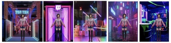 此案空間中聯(lián)華弱化了所有材料組合,模擬宇宙空間,通過色彩肌理、材質(zhì)肌理、微光的表達(dá),通過虛擬人物與現(xiàn)實人的互動結(jié)合,將時間、空間、物質(zhì)的鏈接來詮釋次此設(shè)計主題。聯(lián)華通過設(shè)計手法激發(fā)人的五感六覺,通過看見的、看不見的,觸碰的到的、觸碰不到的,嗅的到的,嗅不到的去探索我們已知的或未知的生活方式。很多博主聽聞有新奇的裝飾和虛擬人物,懷著好奇之心前來打卡拍照,也是在現(xiàn)實生活中都是第一次接觸到虛擬偶像。