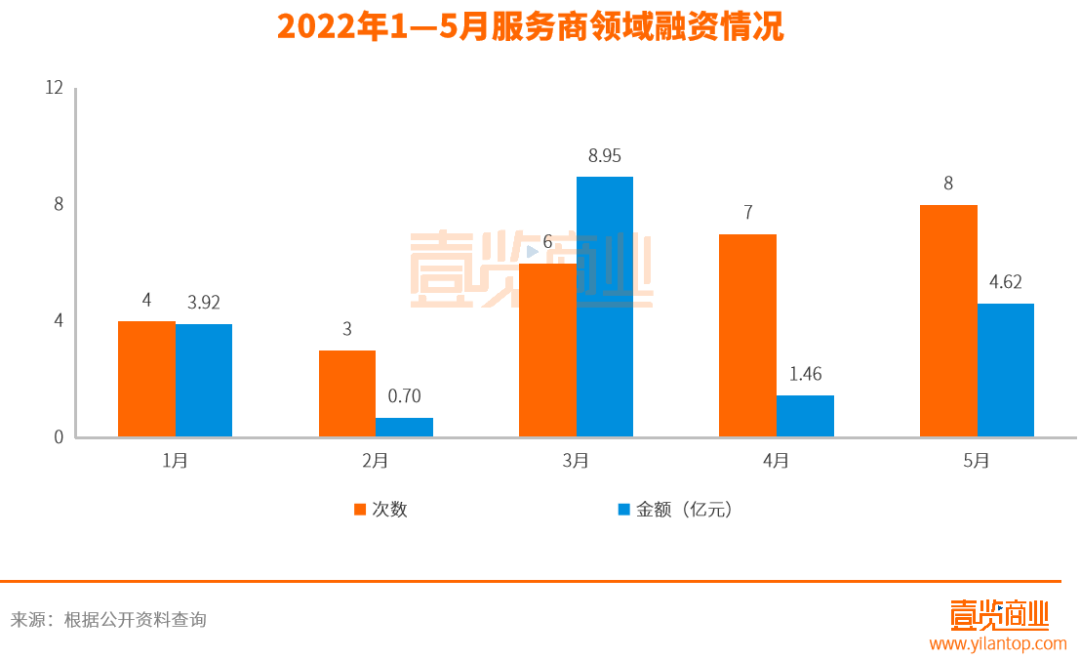 從服務(wù)商來看,自今年1月份以來,該領(lǐng)域在融資方面穩(wěn)步走高。從1月份的4起、2月份的3起、3月份的7起,升至4月份的8起,5月份依舊穩(wěn)步在8起。從融資金額來看,服務(wù)商領(lǐng)域在5月份的總?cè)谫Y金額為4.62億元,除一個項目未披露融資金額外,其余的融資事件均為千萬級以上。