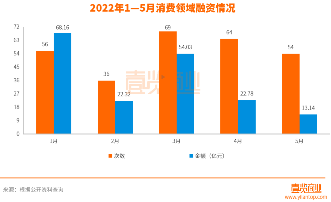其中,在融資事件數(shù)量上,相比4月份的64起,5月份消費領(lǐng)域環(huán)比下滑15.62%;在總?cè)谫Y金額上,相比4月份的32.18億元,5月份消費領(lǐng)域下滑幅度高達59.16%,僅為13.14億元。值得注意的是,繼3月份以來,消費領(lǐng)域在這兩方面已經(jīng)出現(xiàn)了連續(xù)下滑的情況。