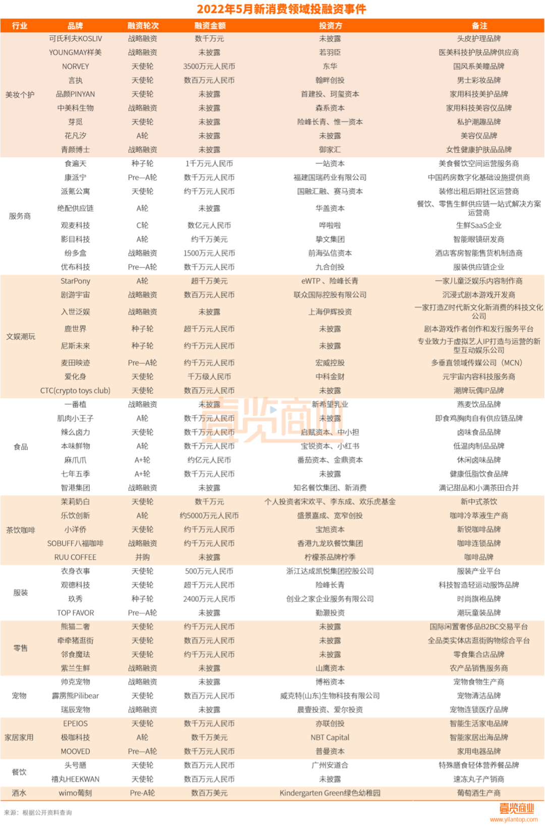 另外,從融資事件分布領(lǐng)域來看,資本關(guān)注的方向也有些許變化。5月份,美妝個護堪稱資本的寵兒,融資事件達到9起,而在4月該領(lǐng)域則無一起。至于在4月份獲得最多數(shù)量融資事件的餐飲領(lǐng)域,在5月份則被資本冷落,僅有2起。與餐飲領(lǐng)域情況類似的還有酒水領(lǐng)域,在五月份中融資事件數(shù)量亦大幅下滑。而服務(wù)商、文娛潮玩、食品三個領(lǐng)域表現(xiàn)則較為穩(wěn)定,融資事件數(shù)量的增減幅度不大。