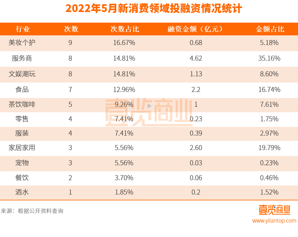 從行業(yè)來看,5月份的融資事件主要集中在美妝個護、服務(wù)商、文娛潮玩、食品領(lǐng)域上,各領(lǐng)域的融資事件分別達到9起、8起、8起、7起。結(jié)合四月份融資情況來看,消費領(lǐng)域在5月份中融資情況變化最大的領(lǐng)域為美妝個護和餐飲。