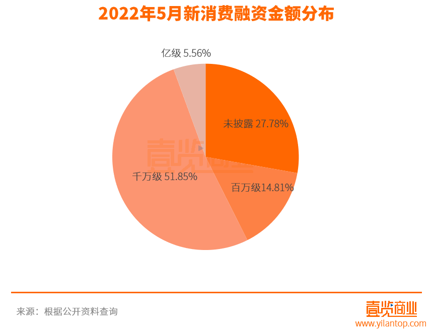 從融資金額來看,除了未披露的15個項目外,5月份的融資金額主要集中在千萬級。其中,獲百萬級融資的品牌有8個,融資金額約為0.26億元,融資次數(shù)占比14.81%;獲千萬級融資的品牌有28個,融資金額約為6.88億元,融資次數(shù)占比51.85%;獲億元級的品牌有3個,融資金額為6億元,融資次數(shù)占比5.56%。其中,獲得億元級融資的3個項目分布在服務(wù)商、食品和家具家用3個領(lǐng)域。
