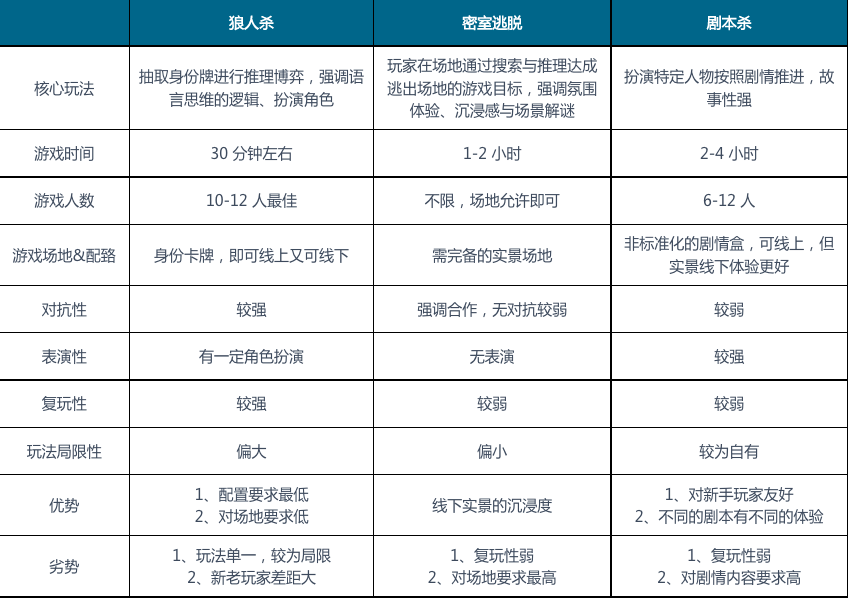狼人殺、密室逃脫、劇本殺游戲特征對比