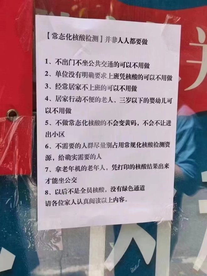 (6)友情提醒:乘公交、去商場(chǎng)、超市要72小時(shí)核酸。但到醫(yī)院開藥必須是48小時(shí)核酸,不要到時(shí)候白跑一趟。另外7天內(nèi)必須要做一次核酸,否則變黃碼,變黃碼后常態(tài)化核酸檢測(cè)點(diǎn)就不能為你做核酸釆樣了,必須要到二甲以上醫(yī)院做核酸采樣,這點(diǎn)大家也要非常注意,否則會(huì)帶來不必要的麻煩(特別說明:朋友發(fā)的,需進(jìn)一步確認(rèn))。