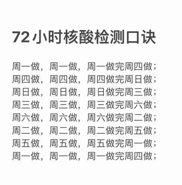 今天又在朋友圈看到一張《72小時(shí)核酸檢測(cè)口訣》。