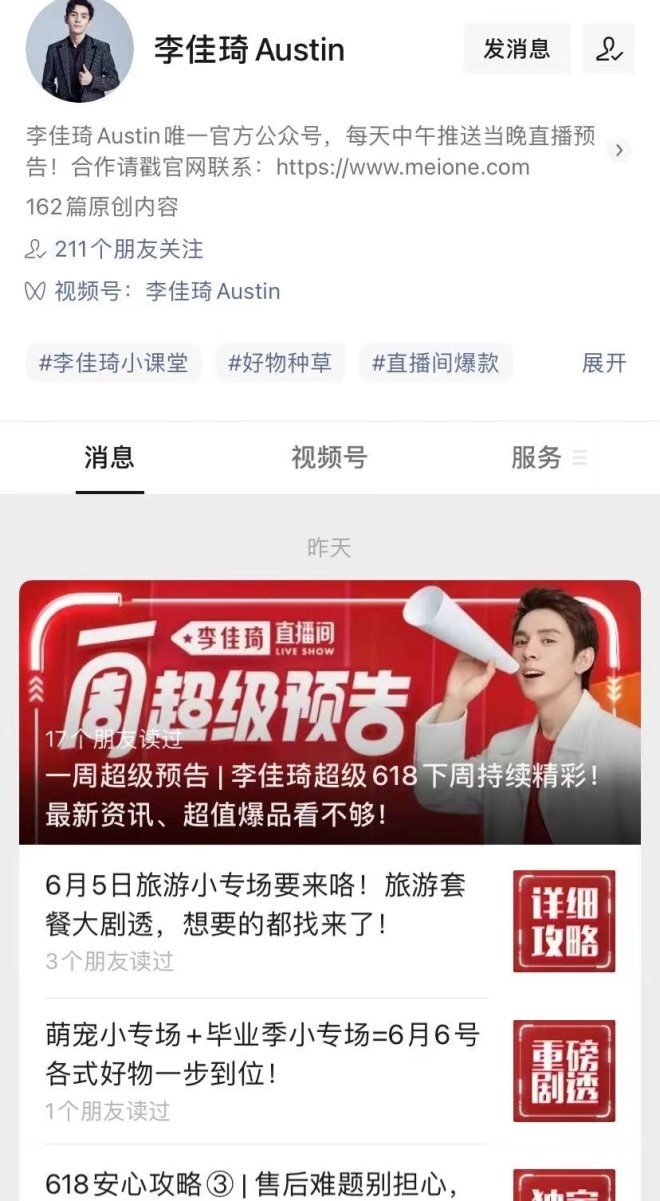 李佳琦個人公眾號每日更新的直播預(yù)告,在6月5日也斷更。最新一條消息是6月4日更新的。