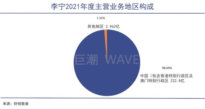李寧面臨的是同樣的尷尬。在2009年,李寧曾經(jīng)提出,十年后實現(xiàn)20%收入來自海外。如今十年已過,根據(jù)2021年年報顯示,海外業(yè)務(wù)占比也僅有1.3%左右,還不如361度。