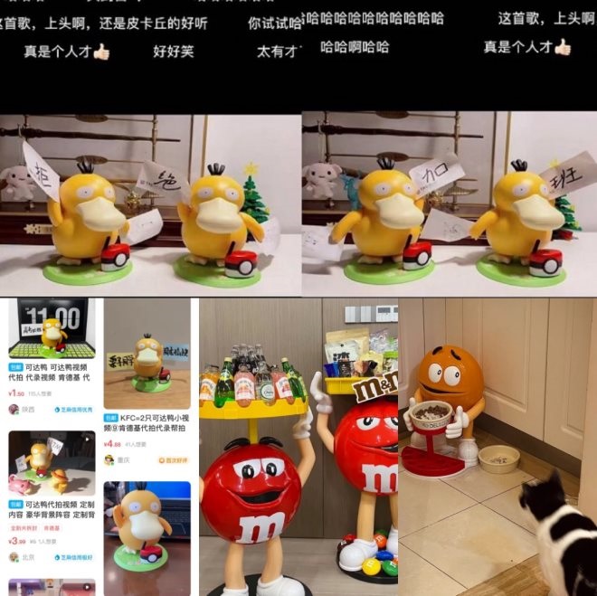先看可達(dá)鴨,從正式面市后,各種與可達(dá)鴨玩具相關(guān)的短視頻就開始刷屏,尤其是可達(dá)鴨那雙交替抬起的手臂,為網(wǎng)友們、甚至各大博主、UP主們進(jìn)行二創(chuàng)提供了極大的空間。在那雙手上粘上寫著不同詞語(yǔ)的紙條,便可以一次一次地出圈。