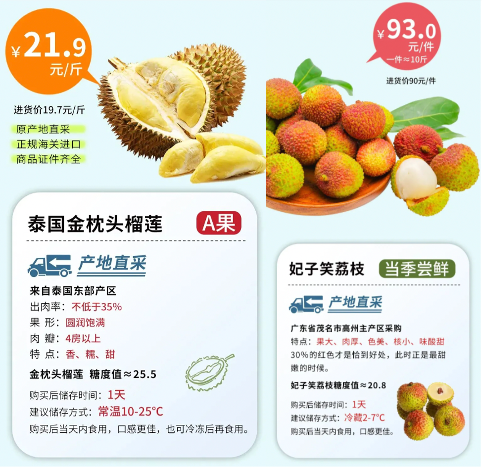 單從毛利率來看,妃子笑荔枝為3%,泰國金枕頭榴蓮為10%,兩類商品均采用產(chǎn)地直采方式,以極低的價格進行銷售,做到批零一體、價格一致。