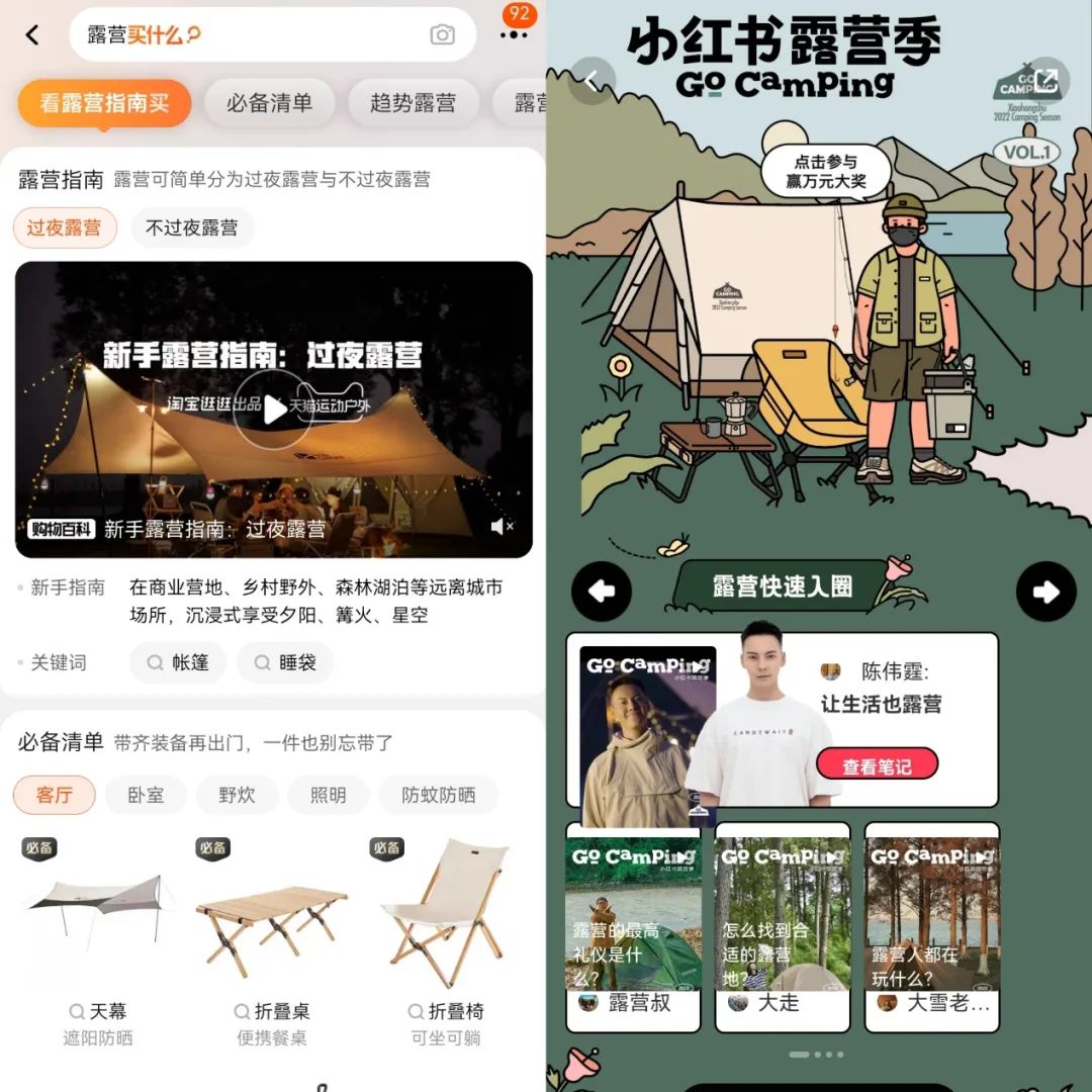 各個內(nèi)容平臺都填滿了露營相關(guān)的內(nèi)容,在小紅書上搜索露營,相關(guān)的筆記有391萬多條,同比2021年增長超過5倍;在短視頻平臺搜索露營,會自動跳出“露營裝備”“露營基地”等聯(lián)想詞條,抖音上#露營#話題相關(guān)的視頻播放量已經(jīng)達(dá)到118億次。