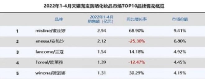 魔鏡市場(chǎng)情報(bào)顯示,2022年1月至4月,在淘寶天貓平臺(tái),mistine蜜絲婷以2.94億元銷(xiāo)售額高居防曬化妝品榜首,同比增長(zhǎng)68.90%,與第二名anessa安熱沙有0.84億元差距,市場(chǎng)份額也由去年的5.00%增加到9.41%,成為當(dāng)前少有的高增長(zhǎng)和高規(guī)模防曬品牌。而在此前三年,安熱沙一直穩(wěn)居防曬類(lèi)化妝品榜首,蜜絲婷三年排名分別第6、第2和第4。