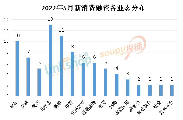 從融資業(yè)態(tài)分布來看,5月份食品飲料領域占比最大,共發(fā)生17起融資事件,但相較4月份略有回落。在餐飲、美妝之外,元宇宙、零售等領域的融資數(shù)量大幅上升。