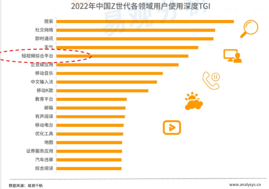 內(nèi)容消費成常態(tài),原創(chuàng)IP的價值顯現(xiàn)。構(gòu)建內(nèi)容消費的閉環(huán),才能獲得更大的經(jīng)濟利益。擁有流量入口是關(guān)鍵。從Z世代各領(lǐng)域的用戶TGI表現(xiàn)來看,短視頻領(lǐng)域的Z世代用戶覆蓋和使用深度TGI兩者數(shù)據(jù)均表現(xiàn)靠前。短視頻已成為Z世代獲取資訊、發(fā)表觀點、參與討論的重要媒介平臺。