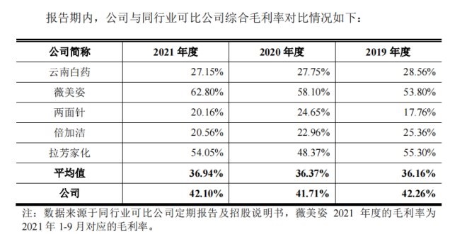 與同行公司相比,2019-2021年登康口腔綜合毛利率略高于可比公司平均值。對此,登康口腔表示,主要系各公司產(chǎn)品結(jié)構(gòu)、業(yè)務(wù)模式、客戶結(jié)構(gòu)等方面存在差異所致。公司綜合毛利率高于云南白藥、兩面針、倍加潔,低于薇美姿、拉芳家化,毛利率處于合理區(qū)間。