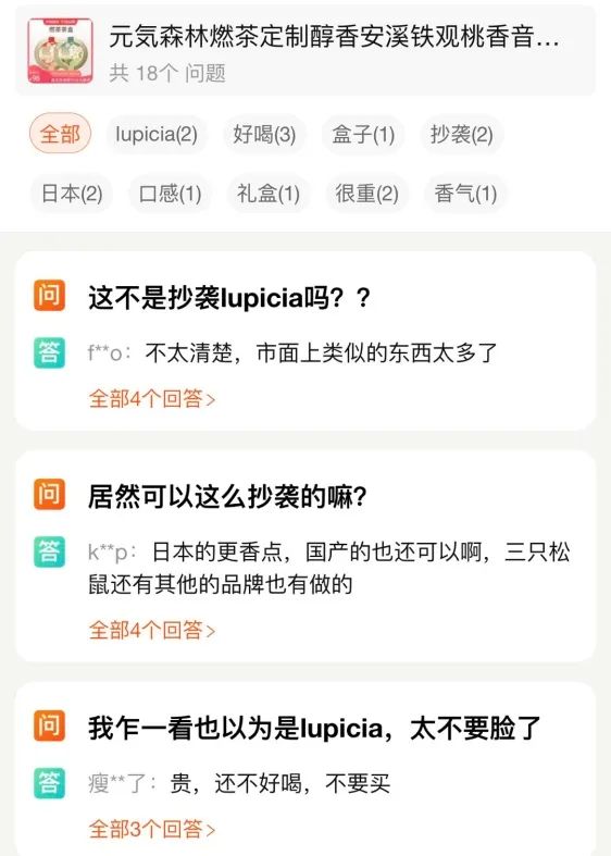 從乳茶被指包裝人物酷似日本品牌不二家的包裝,到2020年推出的茶葉禮盒"燃茶",也被質(zhì)疑與日本茶葉品牌LUPICIA頗為相似。