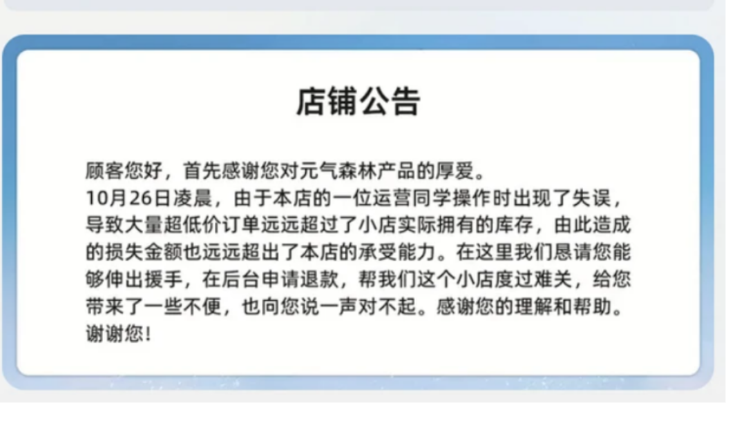 此后元氣森林發(fā)布公告稱價格是運營失誤,希望已經(jīng)下單的用戶可以幫忙退款,不然損失巨大、負(fù)擔(dān)不起。