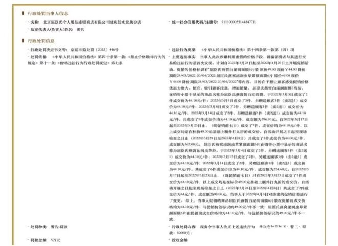 5月10日,該門店違反《價格法》第十四條第一款第(四)項規(guī)定,被北京市延慶區(qū)市場監(jiān)督管理局罰款5萬元。