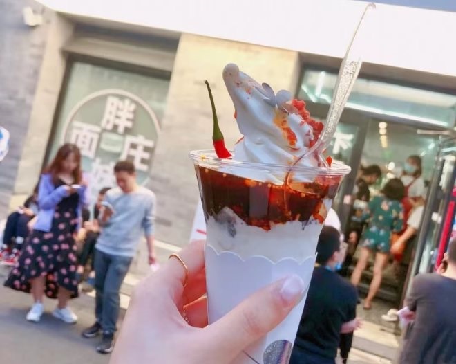 >>>“走食”更靈活,具備傳播屬性。胖妹面莊原本是個吃面的地方,但是嗦完小面,再外帶一個冰淇淋,走在路上回頭率都會變高。這也可以很好地解釋,為什么一堆排隊的網(wǎng)紅吃完面還不肯走,蹲守在店門口拍圖。冰淇淋原本就具備走食零售屬性,只要大膽創(chuàng)新,就能實現(xiàn)“高出片率”。